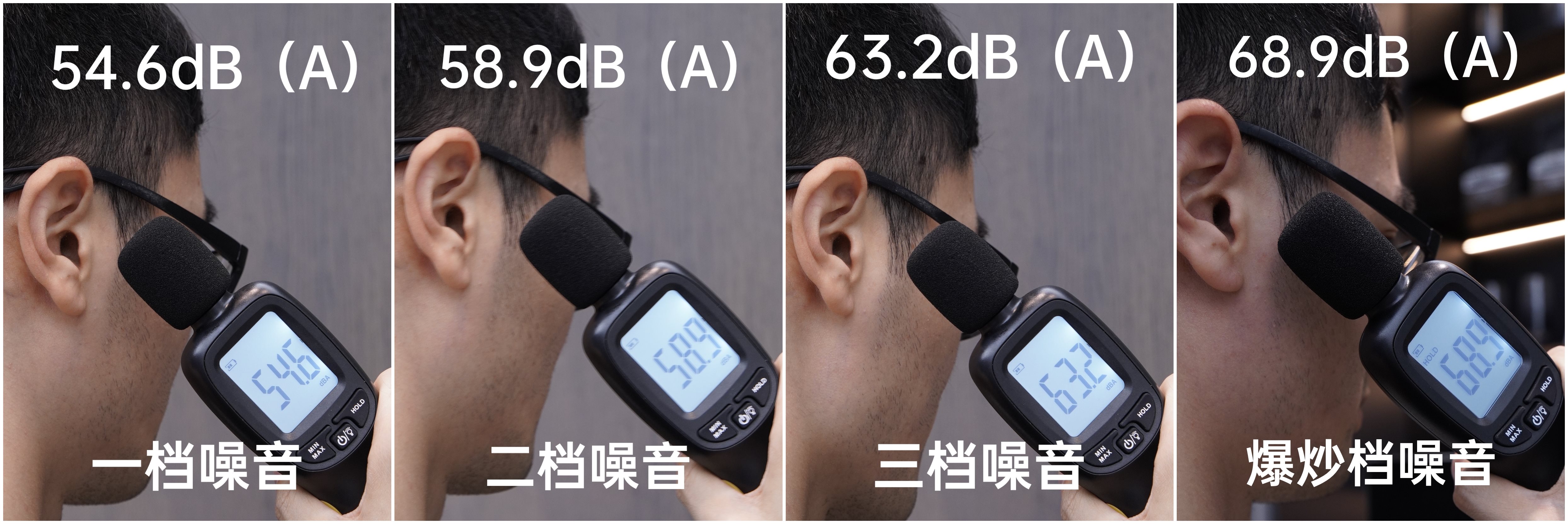 环境噪音为39.4dB(A),将分贝仪放在人耳旁,测试人耳听到的烟机噪音大小。最大的爆炒档噪音为68.9dB(A),低于国标规定的噪音标准,使用常用档位产生的噪音更低,影响更小。