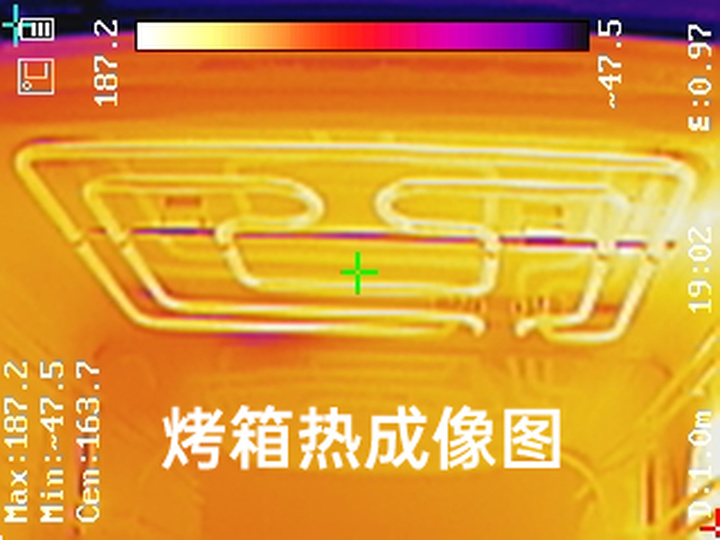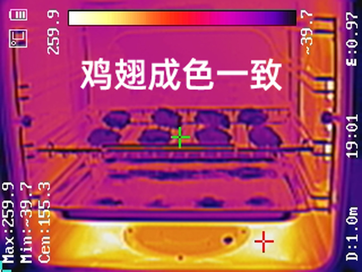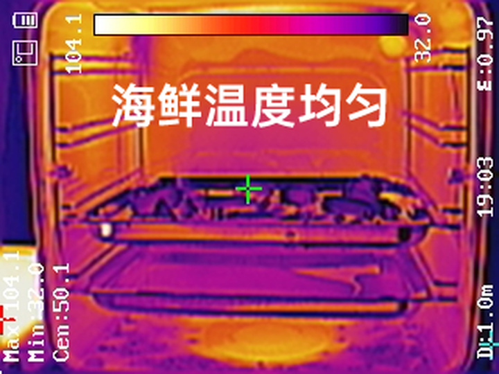 热成像图显示烤箱和蒸箱内部热力分布均匀,出锅时,食材温度一致,成色相同。