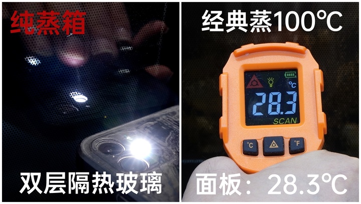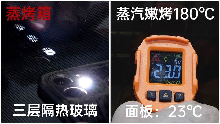 烹饪过程中,烤箱内部温度为180℃左右。此时用测温枪分别测试箱门表面温度,三层隔热玻璃能隔绝大部分热量,实测烤箱箱门温度仅23℃左右,碰触箱门不会感觉烫手。